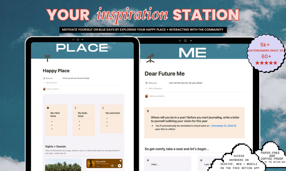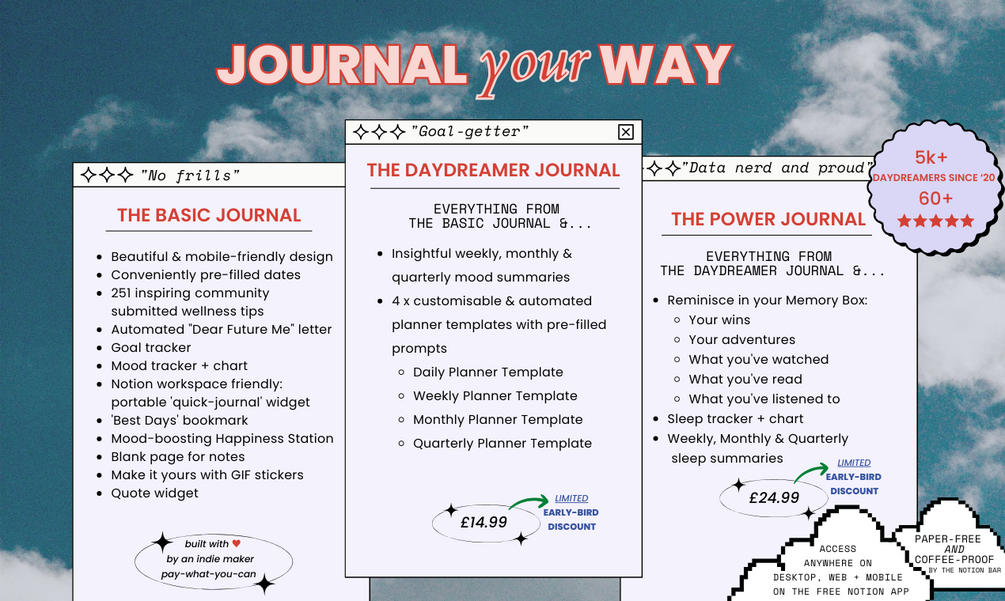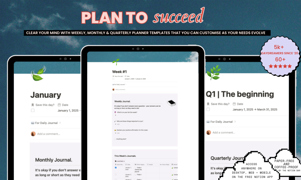 - 4 x customisable & automated planner templates with pre-filled prompts (Daydream and Power Journal only)